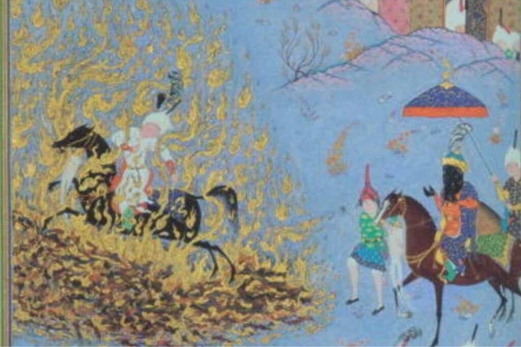 Feuer wurde in unseren Traditionen und unserer Geschichte immer respektiert. Siavash kam unversehrt aus dem Feuer heraus, weil er rein und unschuldig war. Der schöne Brauch, über das Feuer zu springen, stammt aus dieser Geschichte. In Gassen oder offenen Plätzen entzünden wir ein Feuer, und mit Familie und Freunden springen wir abwechselnd über das Feuer und singen dabei:
