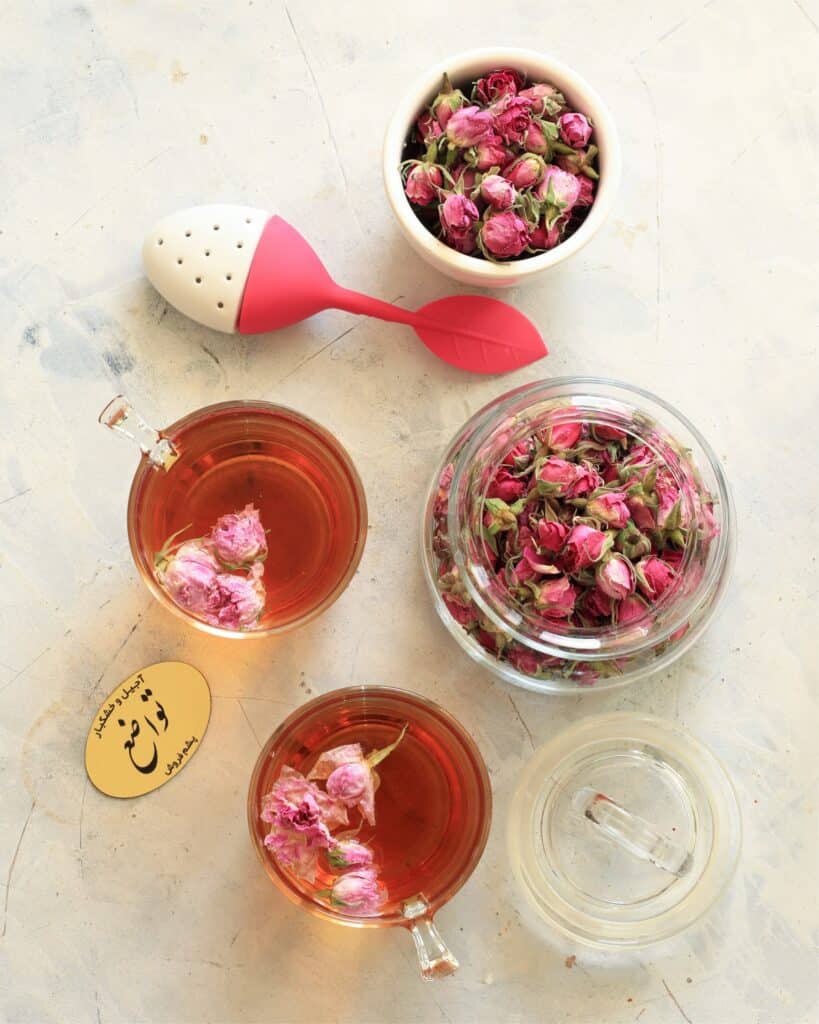 Wir haben auch zwei Kräutertees, einen für den Morgen und einen für den Nachmittag. Am Morgen können Sie sich mit einer Mischung aus Zitrone, Minze, roten Rosen und grünem Tee erfrischen und bereit für einen weiteren aktiven Tag sein. Am Nachmittag genießen Sie einen Tee mit Granatapfel, Minze, roten Rosen, Kuhzungenblume, Baharnarenj und grünem Tee, um die Müdigkeit des erlebnisreichen Tages zu vertreiben und ein Lächeln der Entspannung auf Ihr Gesicht zu zaubern!