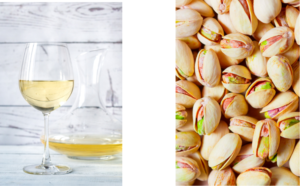 The sweet and fresh characteristics of Sauvignon Blanc pair well with the slightly salty and flavorful pistachios, creating a refreshing combination for warm days and exploring enticing flavors.