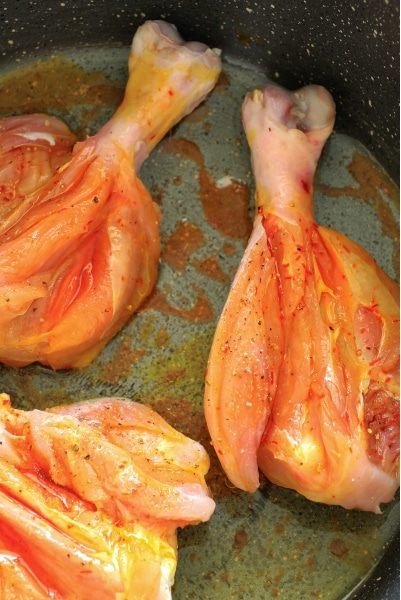 While frying, pour saffron on the chickens in several steps. Repeat this three or four times until the chickens are completely saffrony.