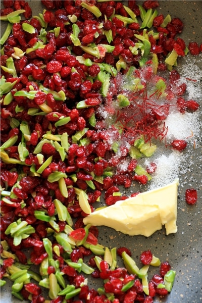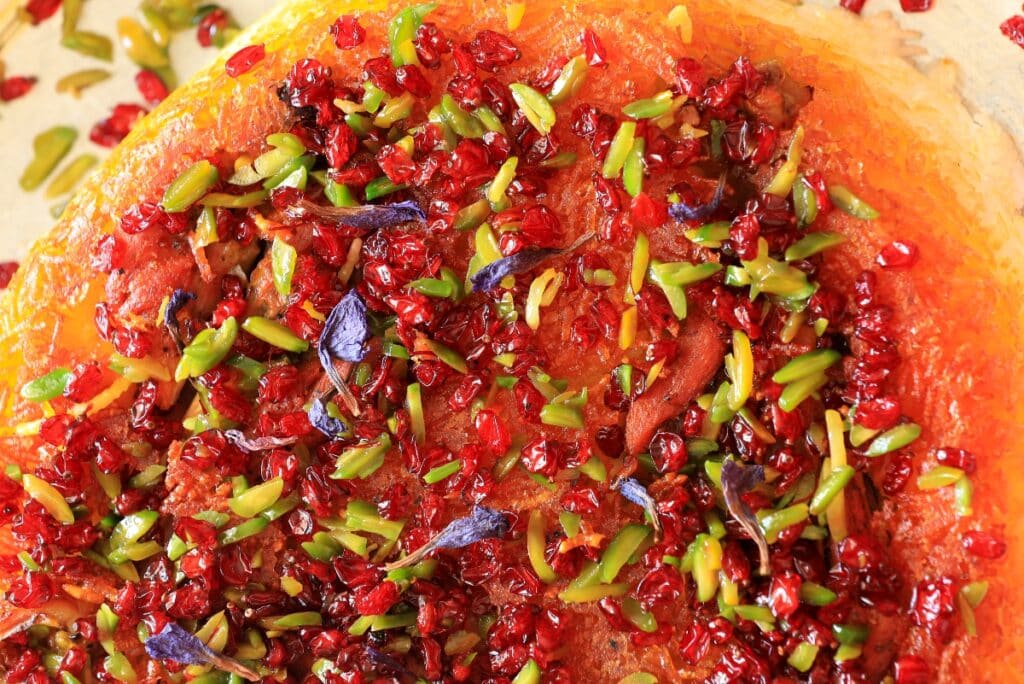Now that the food is ready, let me tell you that it makes a magical combination with barberry and pistachio slices! Fry these two delicious with a spoonful of sugar, saffron and butter and decorate the food.