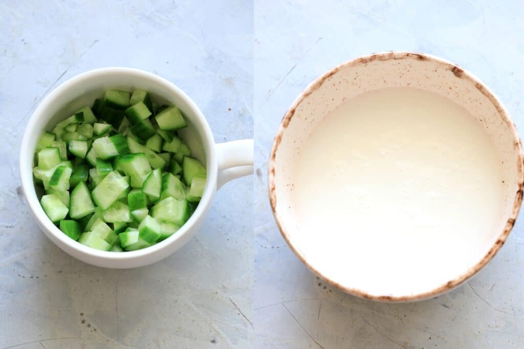 - Start by adding the chopped or grated cucumbers to a large mixing bowl.