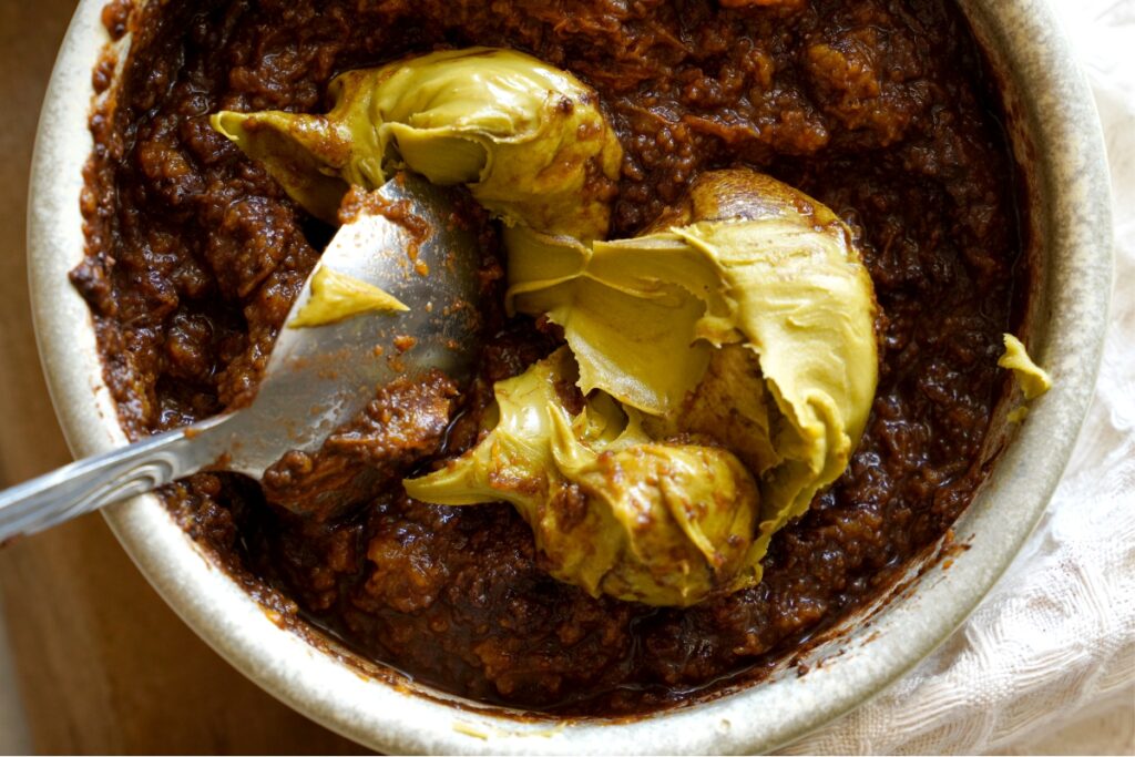 پودر کاکائو و پوره کدو رو با هم مخلوط کنید. کره پسته رو هم اضافه کنید. چون کدو و کره پسته 45% هردو شیرین هستن دیگه لازم نیست شکر اضافه کنید. کره رو هم اضافه کنید و طوری هم بزنید که رگه هایی از کره توی مخلوط مشخص باشه، یعنی قبل از یکدست شدنش از هم زدن دست بکشین.