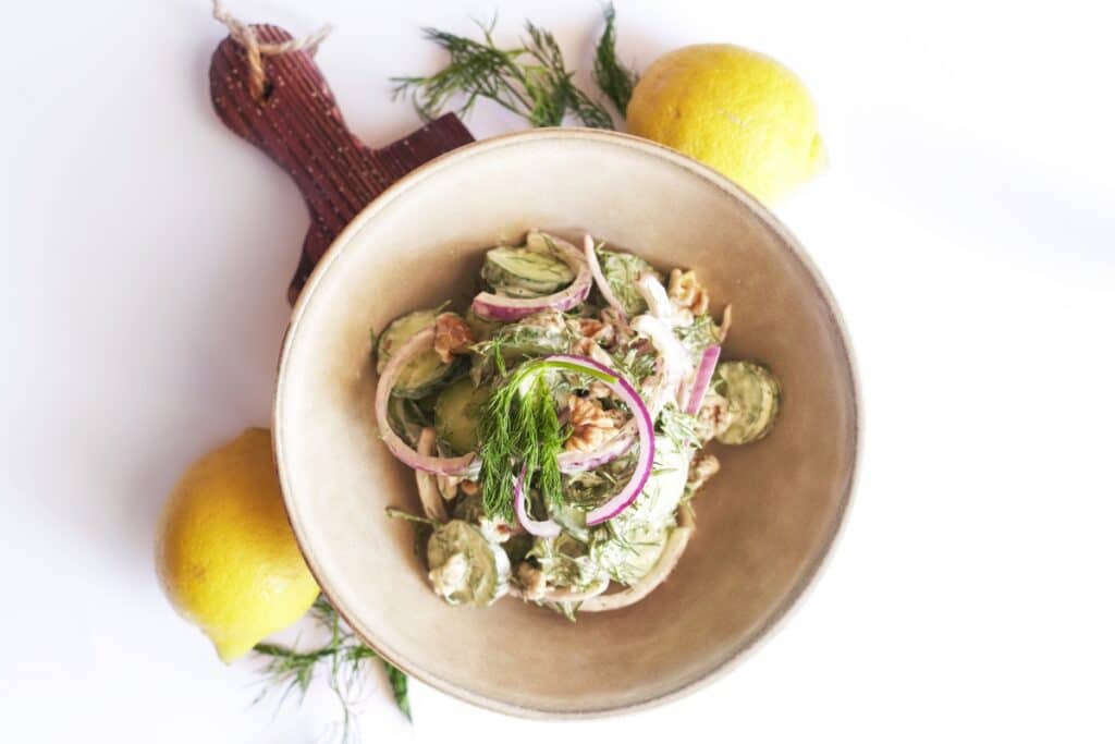 خیار یکی از بهترین سبزیجاتیه که می تونیم در تابستون استفاده کنیم. چرا؟ چون بیشتر از ۹۰ درصدش از آب تشکیل شده و همین باعث میشه که بدن ما به راحتی هیدراته بمونه. علاوه بر این، خوردن سالاد خیار به کاهش دمای بدن کمک می کنه و می تونه یه انتخاب عالی برای روزهای داغ تابستونی باشه. با اضافه کردن پیاز قرمز، شوید و مغز گردو، به این سالاد طعمی متفاوت و منحصر به فرد میدیم و یه سالاد فصل ساده آماده میکنیم. بیاین طرز تهیه سالاد ساده رو با هم ببینیم.