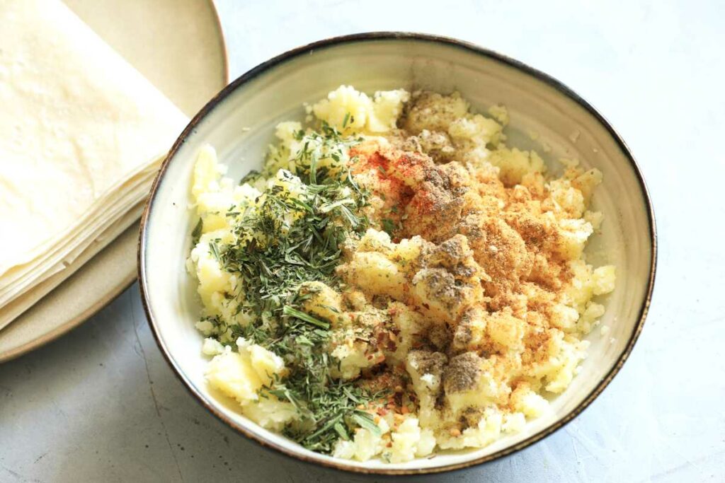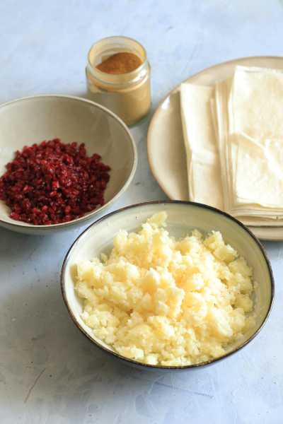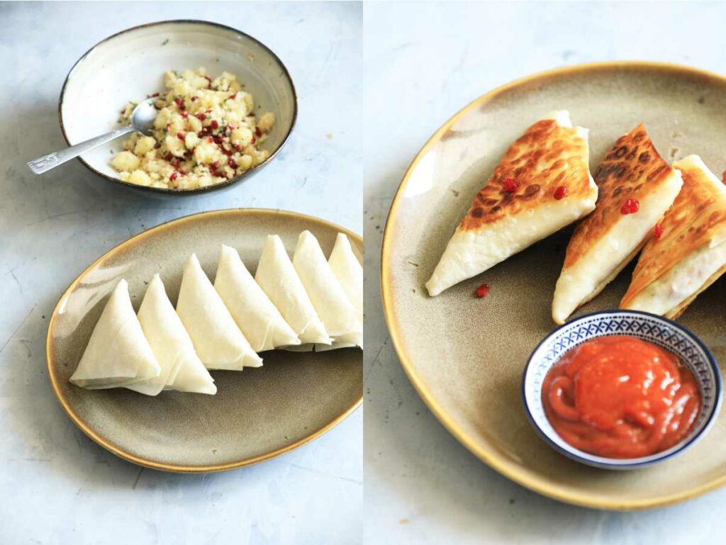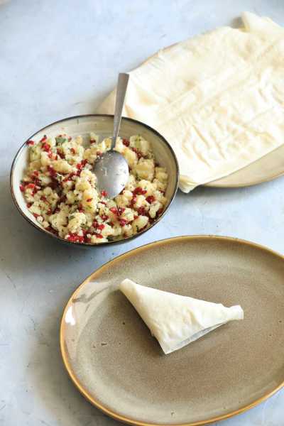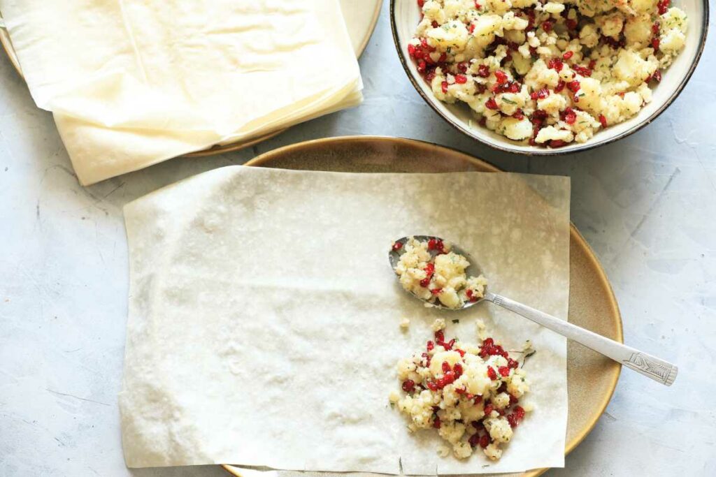 حالا مواد رو توی خمیر یوفکا و یا نون لواش بقچه پیچ کنین. حالا میتونین بهش کمی روغن بزنین و توی فر بذارین، اما خوب اون مزه لذیذ و قرچ قرچ اصیل و خوشمزه رو که لذت دنیا رو بهمون میده، فقط با سرخ کردن توی روغن میشه به دست آورد… انتخاب با شما!