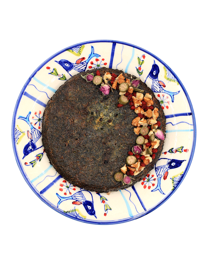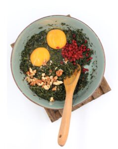 ewürze nach Belieben hinzufügen. Für zwei Tassen Kräuter reichen zwei Eier. Je nach Geschmack getrocknete Berberitzen und gehackte Walnüsse hinzufügen.