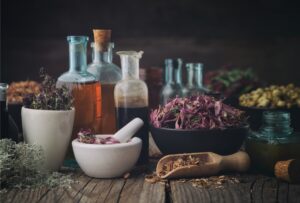 Kräutertees, die je nach Art eine Vielzahl von Heilungseigenschaften haben. Zum Beispiel Kamillentee, Eibischtee und Zitronentee; oder eine Kombination aus jedem davon.