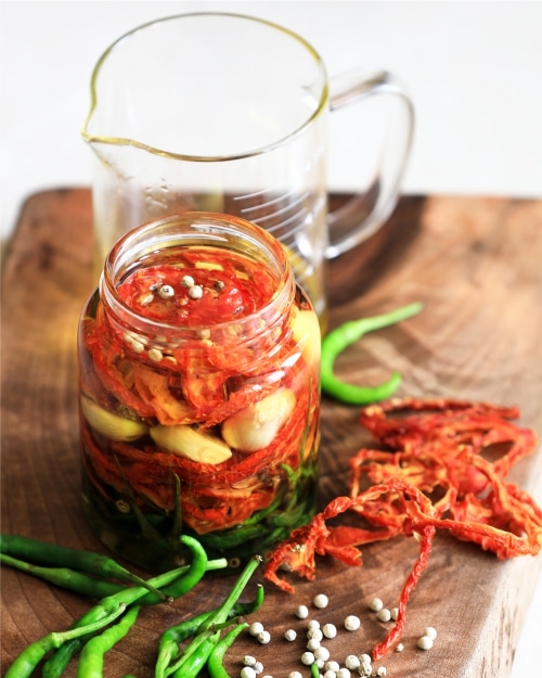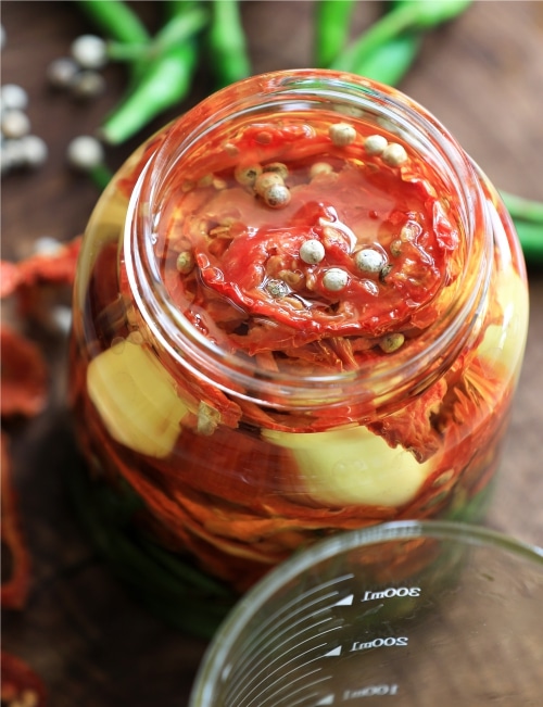 Im letzten Schritt gießen Sie Olivenöl in das Glas, bis es alle Zutaten bedeckt. Jetzt können Sie die sonnengereiften, geschmackvollen Tomaten im Kühlschrank aufbewahren. Verwenden Sie sie in Nudeln, Salaten, Sandwiches oder mit Ihrem Lieblingskäse zum Frühstück oder als Snack.