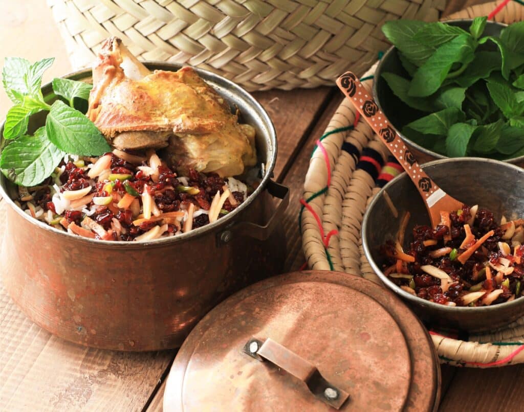 Der bunte Reis ist eine köstliche Kombination aus Mandeln, Pistazien, gesüßter Orangenschale und Berberitzen, die nicht nur für einen angenehmen Geschmack sorgt, sondern auch auf Veranstaltungen beliebt ist und das Kochen für uns angenehmer macht.