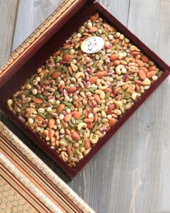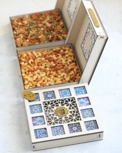 Auf unserer Website haben wir auch ein Siegel-Paket, das die Kunstfertigkeit der talentierten Handwerker zeigt. Siegelarbeiten sind eine feine und schöne Kunst, die durch das geschickte Anordnen von dünnen Holzschnitten und dem erneuten Zusammensetzen entsteht. Es ist eine sehr zeitaufwändige Kunstform, und das Schenken eines solchen Kunstwerks kann zeigen, wie wichtig uns jemand ist und wie sehr wir ihn schätzen. Darüber hinaus kann es ein sehr formelles und elegantes Geschenk sein. In diesem Paket können Sie auch zwischen salzigen oder süßen Nüssen wählen, je nach Ihrer Vorliebe. So können Sie Geschmack, Farbe und Kunst in einem Geschenk an Ihre Freunde und Familie weitergeben.