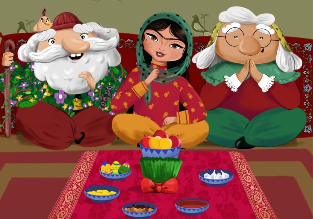 Die Tradition, Eidi (Geschenke) zu geben, hat verschiedene Erzählungen. Abu Rayhan Biruni zitiert Azarbad (Mobad Baghdad) und sagt: „Zucker wurde am Tag von Nowruz entdeckt, und davor wusste niemand davon. Jamshid sah einmal eine Substanz aus einem Rohr herausfließen, kostete sie und als er feststellte, dass sie süß war, befahl er, sie zu extrahieren und daraus Zucker herzustellen. Die Leute gratulierten sich zu Nowruz, indem sie sich gegenseitig Zucker als Geschenke gaben. Diese Tradition wurde auch bei Mehregan wiederholt, und das Schenken von Geschenken wurde zur Gewohnheit.“